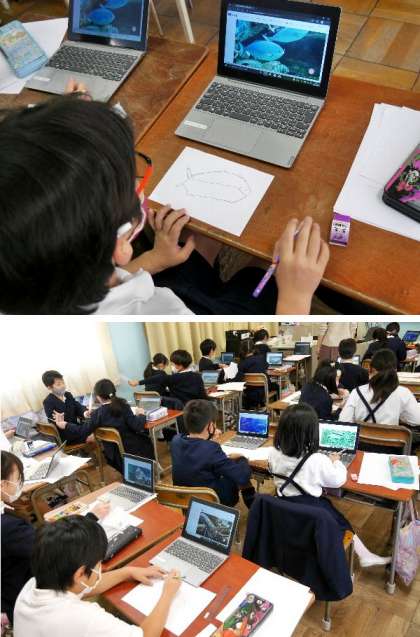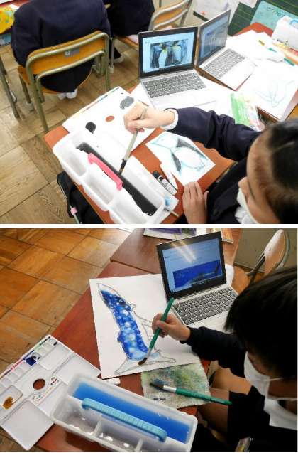 3年生は先日、遠足で海遊館に行って、たくさんの海の生き物をみましたね。インターネットで調べて、絵を描いています。