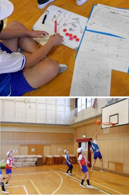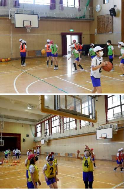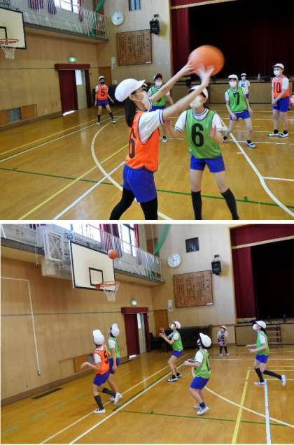 6年生の体育ではバスケットボールをしています。どんなふうにパスをまわすか作戦をたてて練習試合をしていました。さすが6年です、迫力あるシュートがいいですね。