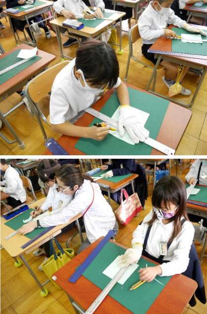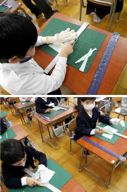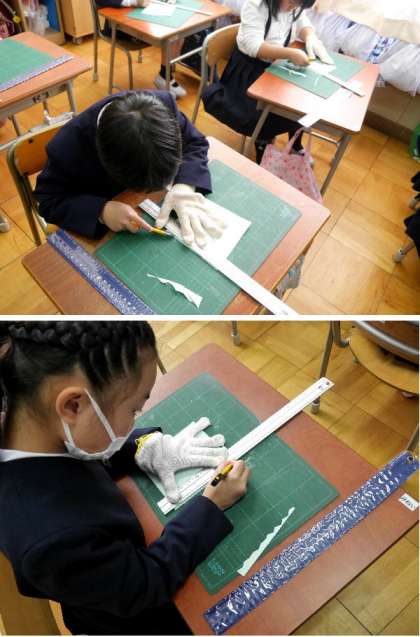 2年生が、カッターナイフを使って紙を切る練習をしていました。安全に気をつけて慎重に作業をしていました。
