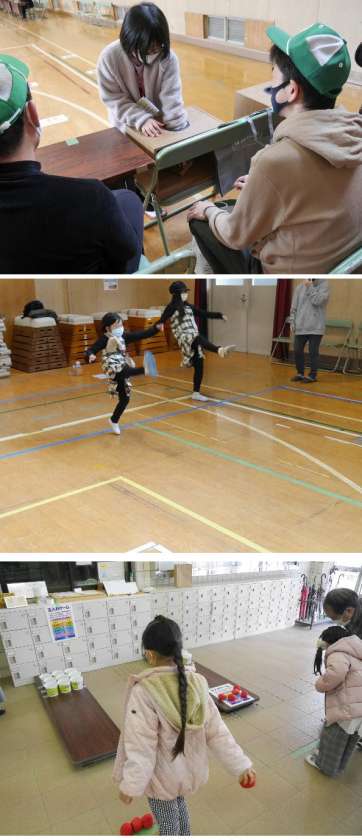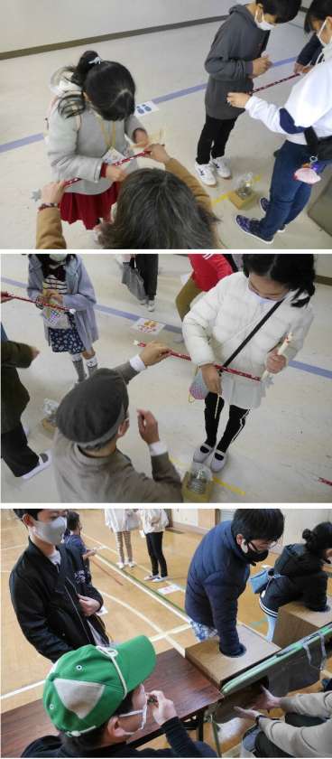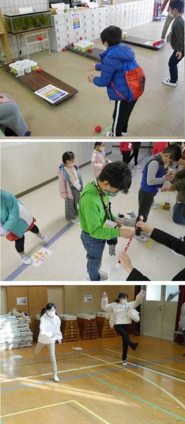 子ども会のお楽しみ会で、子どもたちはいろいろなゲームをして楽しみました。スリッパけり、スポーツスタック、中みあて、消火器体験、棒入れ、玉入れ、豆つかみなど、とても楽しいコーナがあります。