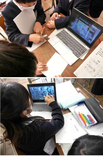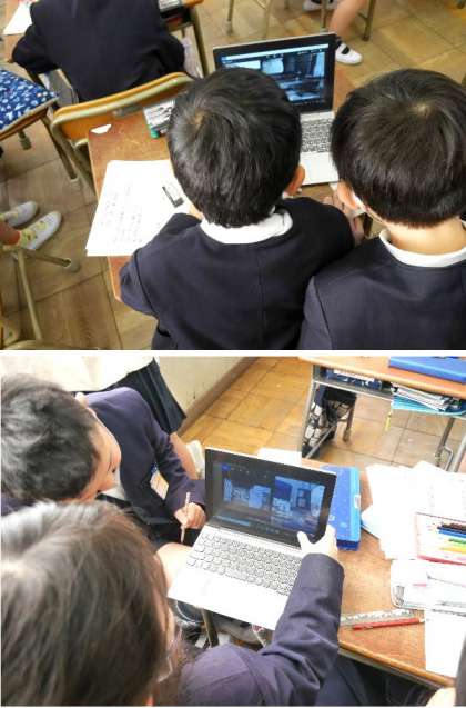 2年生のの町探検、お店訪問の様子は、子どもたちがタブレットで撮ってきたので、それを確認しながらまとめの文を書いています。