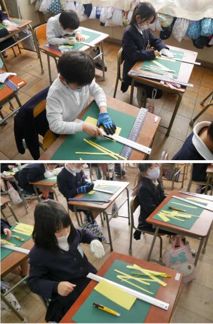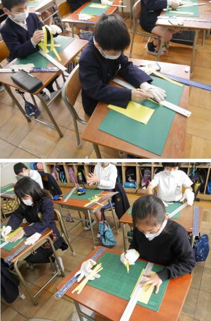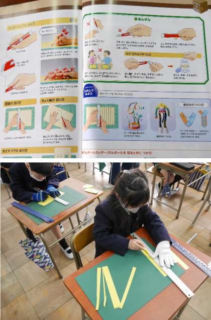 2年生では、カッターナイフを使って作品作りをするために、カッターの使い方を練習しています。手を切らないように気をつけてくださいね。カッターナイフの特性をわかって使えるようになりましょう。