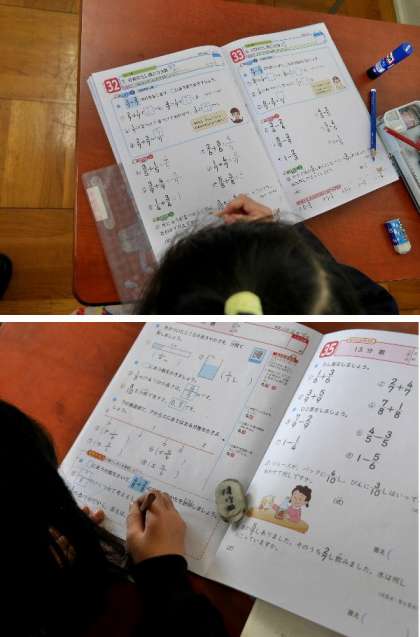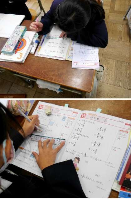 3年生の算数では、分数について学習しています。1からひき算するためには、分母をあわせないといけません。計算の練習をしっかりしているところです。計算のやり方をおぼえるのではなく、何のいみがあるのか理解して計算していきましょう。