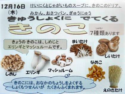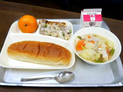 器用の献立は、鶏肉とじゃがいものスープ煮、きのこのドリア、みかん、おさつパン、牛乳でした。ドリアが人気でした。
