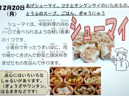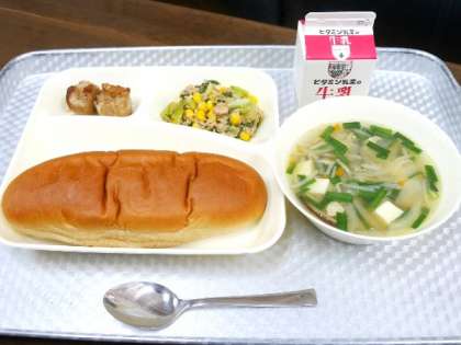 今日の献立は、あげシューマイ、ツナとチンゲン菜の炒め物、豆腐のスープ、ごはん、牛乳でした。