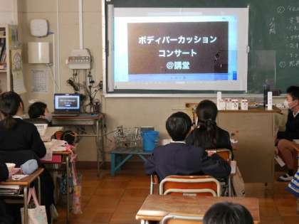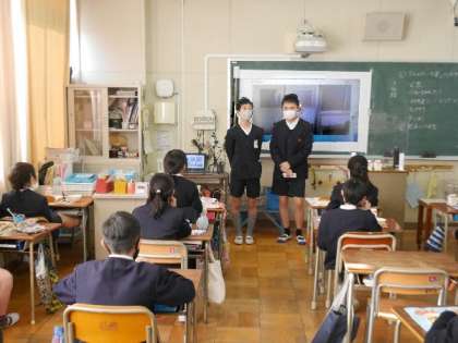 給食の時に、6年生が23日に行う予定の6年合奏・合唱の告知をしにきてくれました。宣伝用のビデオも作っていました。楽しみですね。