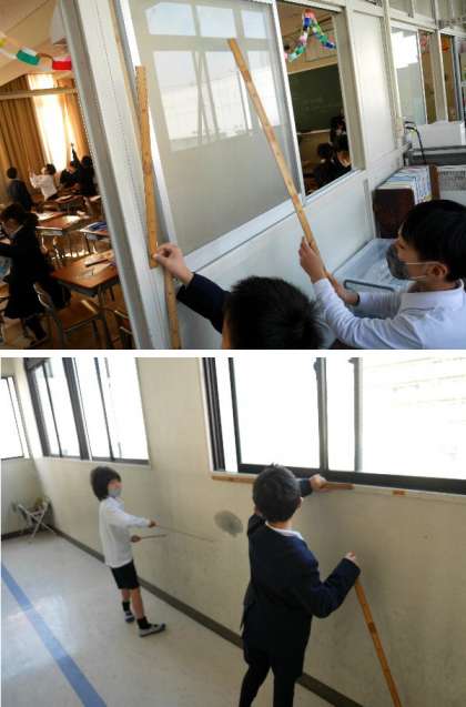 2年生が1メートルのさしをもって、教室のあちらこちらの長さを測っています。正しく目盛りを読むのってむずかしいですね。先生の身長も測ってくれました。