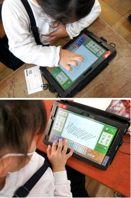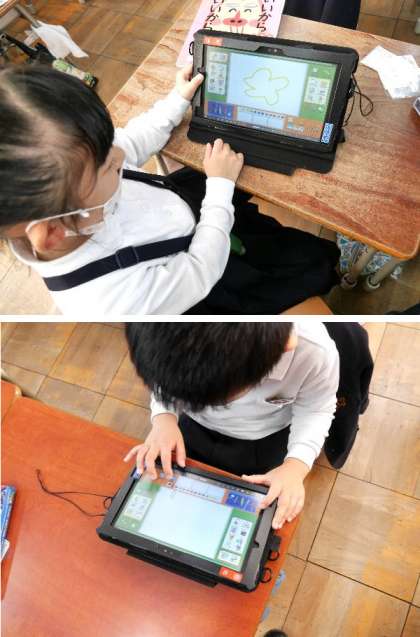 1年生がタブレットを使って、絵を描いたり、タブレットドリルで学習していました。だいぶ、ログインにも慣れてきましたね。
