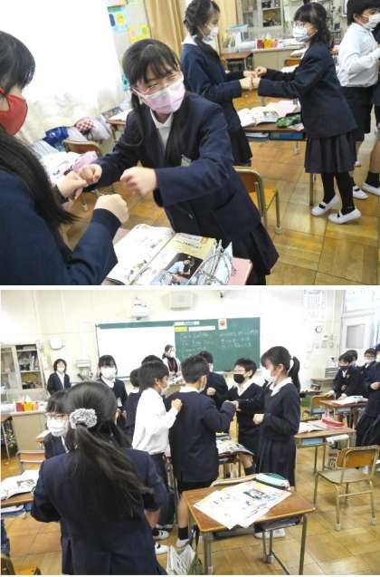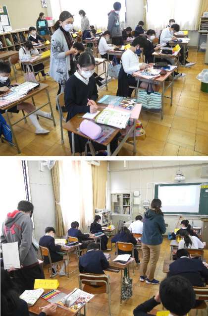 5年生の英語に、本校の若い先生がたが勉強のために見学しています。英語を使ってあいさつを楽しく学習しています。今日は、新年の年賀状を英語で作っていました。