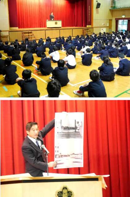 明日は、創立から80年目となる創立記念日です。学校の創立を写真で見てもらってお話ししました。