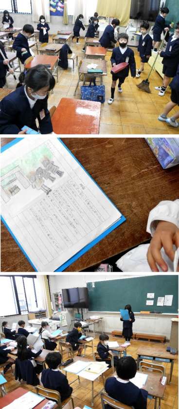 3学期の始業式のあと、各学級では、清掃活動や、提出物を集めたりしていました。冬休みの絵日記を発表しているところもありました。