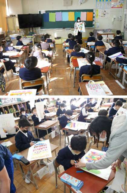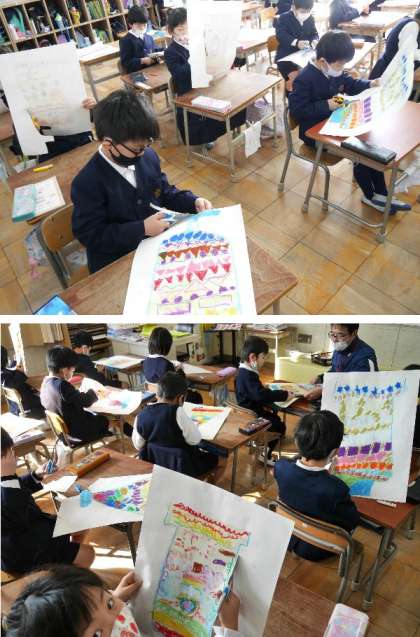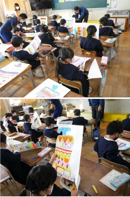 1年生の図工では、「すてきなパフェ」の絵をクレヨンや絵具などの具材を使って描いてきました。最後の仕上げにパフェを切り抜いて色画用紙の台紙にはっていきます。
