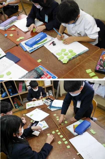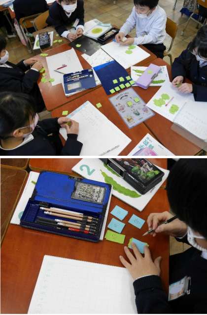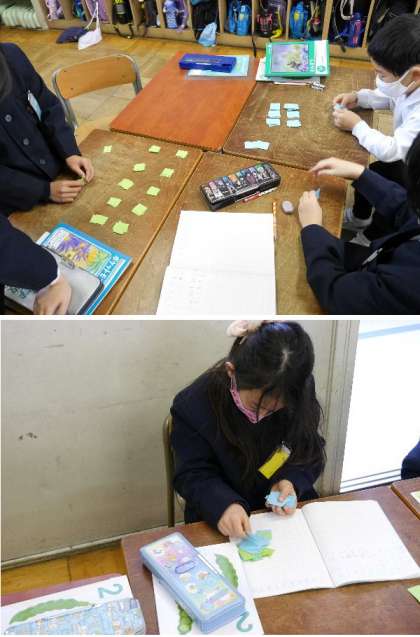 2年生の算数です。たくさんの紙の枚数を数えています。どんなふうに数えると早く正確にかぞえられるかな。まとまりを作るといいみたいですね。