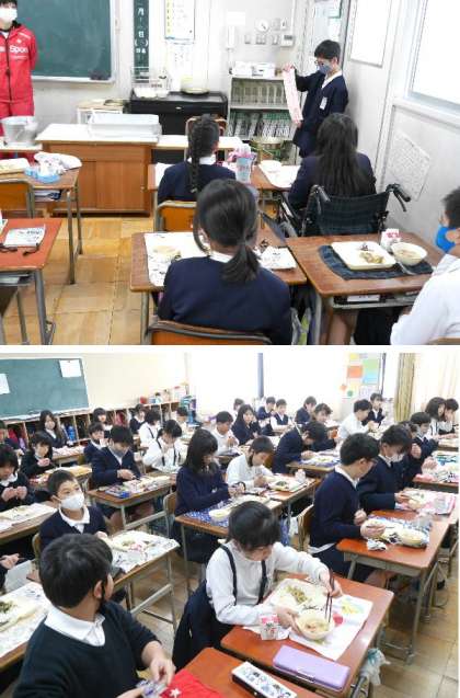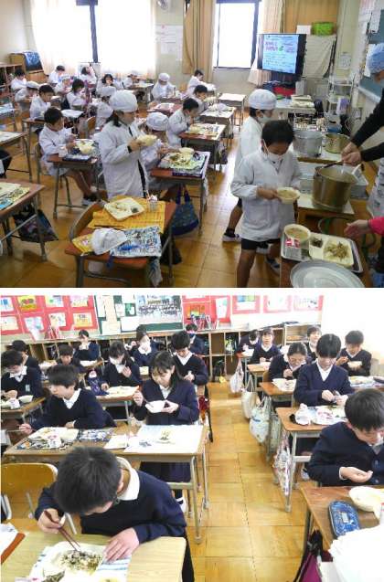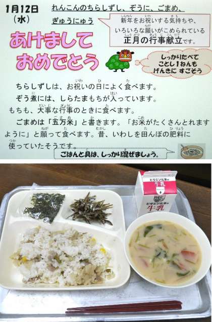 今日の献立は、れんこんのちらしずし、ぞうに、ごまめ、牛乳でした。今日から給食がはじまりました。お正月の献立メニューですね。雑煮のしらたまもちが人気でした。