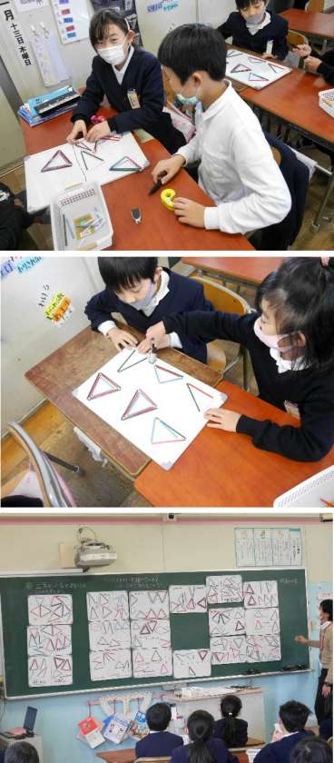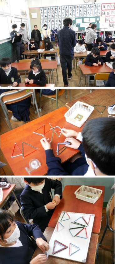 を調べよう」です。長さの違ういろいろなストローを組み合わせて、ペアで三角形をたくさん作りました。その三角形をどういうふうに仲間分けするか考えてました。