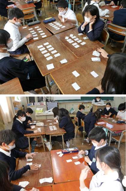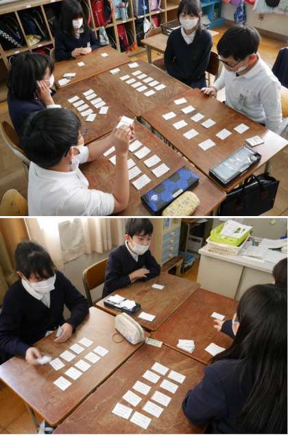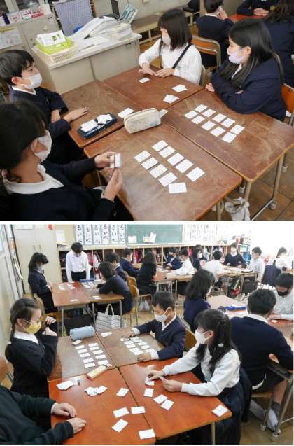 4年生が、百人一首の札とりをしていました。日本の昔の言葉遣いなどを楽しみながら学習しています。