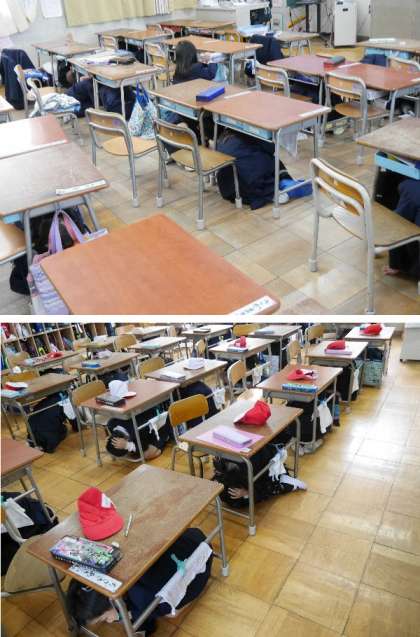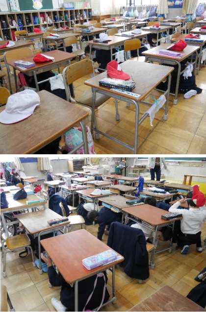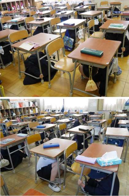 避難訓練は、毎学期あります。今回は地震と津波を想定したものです。休み時間の10時30分に訓練の放送があります。1年生と2年生が、教室で机の下に入って、身の安全を確保する行動をしています。