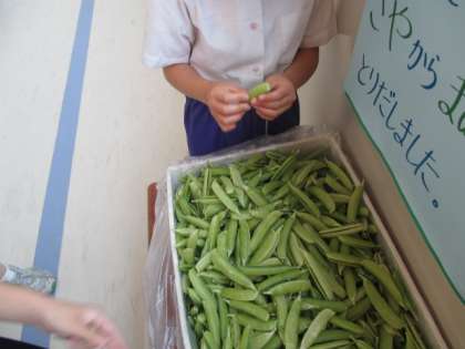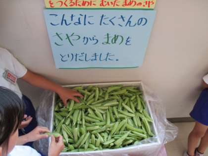豆を取り出した後、職員室前の廊下に置いて、子どもたちが見られるようにしています。