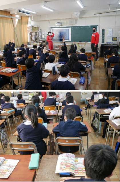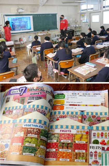 4年生の英語です。クリス先生も来てくれています。今日は「何がほしいですか」と市場にきています。ピザ?野菜?フルート?何がほしいですか。