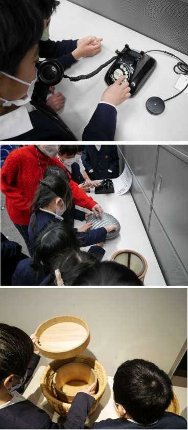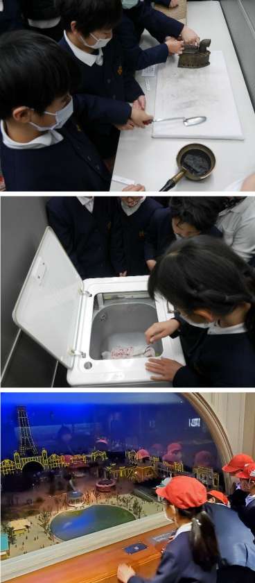3年生は、社会見学に行きました。電車で天神橋筋6丁目まで行きます。大阪くらしの今昔館では、日本の昔の暮らしや道具などを体験できます。先生にとっては懐かしいものばかりです。子ども達にとっては初めて見るものもあり、使い方もわからないようですね。3年社会科の勉強になります。