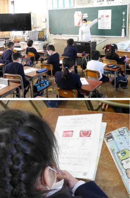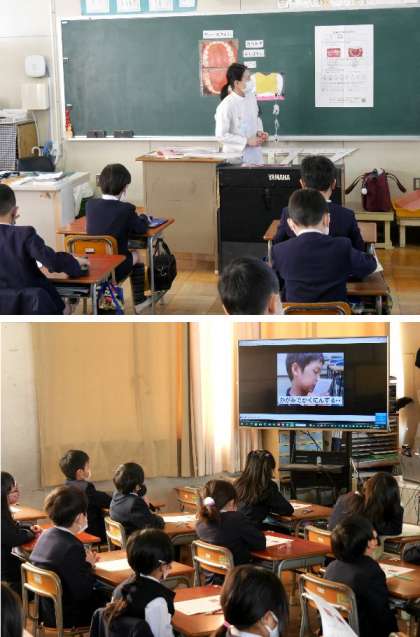 今日は、2年生で、口腔衛生指導に歯科校医さんがきてくれました。歯みがきのしかたを学習しました。