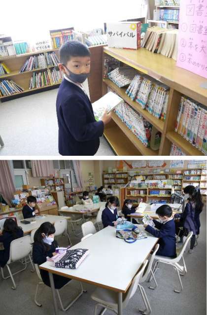 2年生が図書室で読書や本を借りています。週に1回は図書室の日がどの学級でもあり、自由に本を借りたり読んだりできます。金曜日は毎週、図書補助員の方にきていただいています。