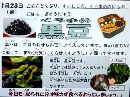 今日の献立は、親子どんぶり、すまし汁、黒豆の煮物、ごはん、牛乳でした。