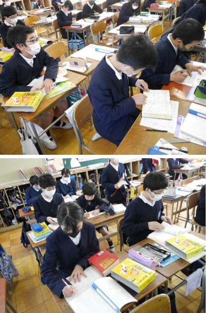 6年生の国語では、「プロフェッショナルたち」の単元を学賞しています。教科書に出てくる語句を国語辞典で調べていました。インターネットで調べるのが早いかもしれませんが、辞書を使うことも大切です。