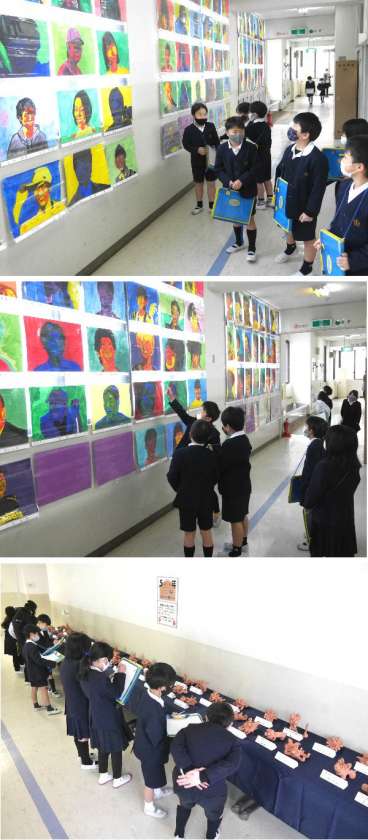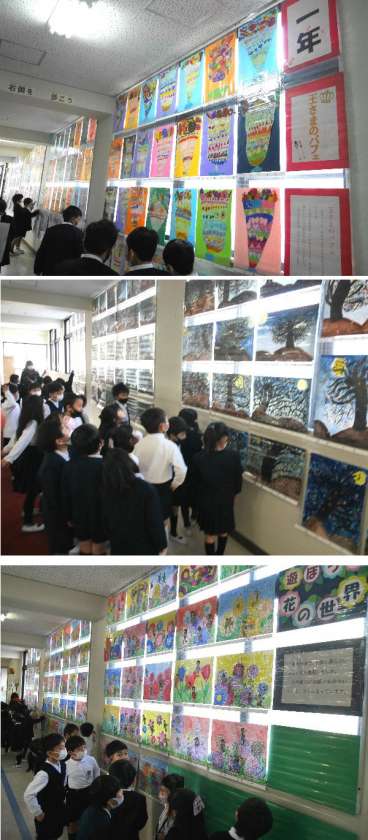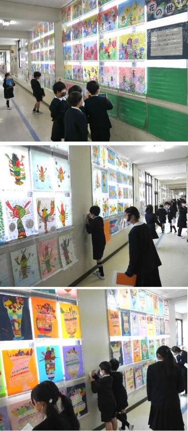 今日から作品展です。昨日に先生がたで展示の準備をしました。今日から各学年学級で作品の鑑賞で回ります。他の学年の作品に関心したり興味をもって鑑賞していました。