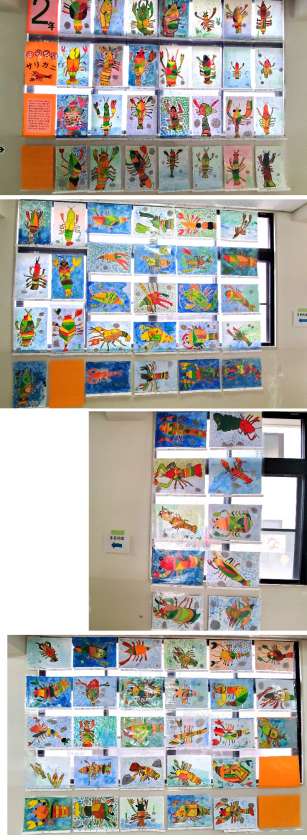 2年の作品は、「カラフルザリガニ」です。飼っていたザリガニの体のしくみをひとつひとつ確かめて描きました。何色ものパスを使って色混ぜを楽しみながら、根気よく塗り込んで立派なザリガニに仕上げました。また、自分の描いたザリガニが住む川や池の色にぴったりくる色を見つけて、今年初めて学習した絵具で表現しました。2年生が描いた、色とりどりのザリガニをご覧ください。