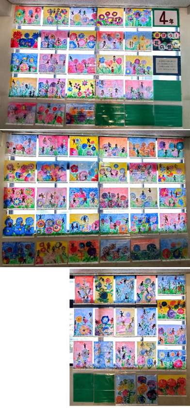 4年生は、「遊ぼう!花の世界」です。花の世界で、友達と遊んでいるところを表現しました。人の後ろには紙バネがついていて、3Dになっています。