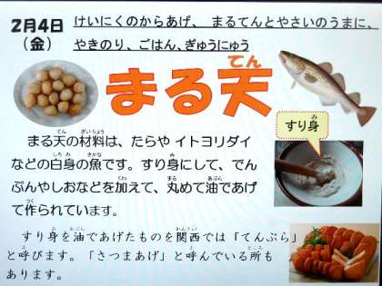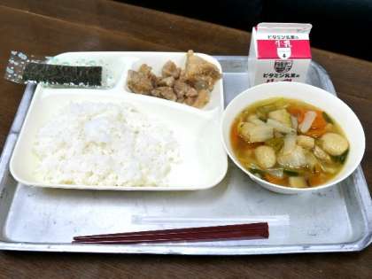 今日の献立は、鶏肉のからあげ、まるてんと野菜のうま煮、焼きのり、ごはん、牛乳でした。