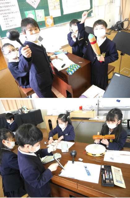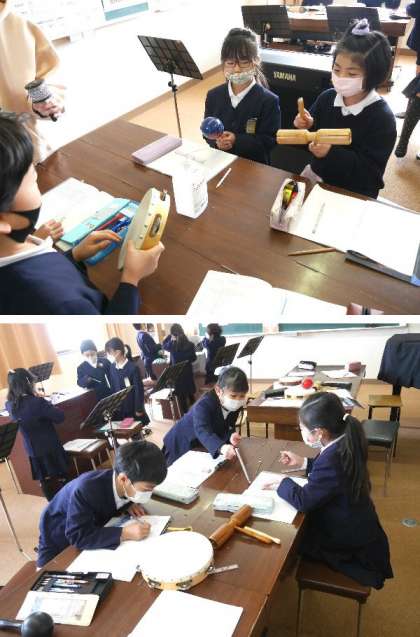 3年生が音楽室で、いろいろな楽器で音を出してみました。音を出すのにもいろいろな方法がありますね。