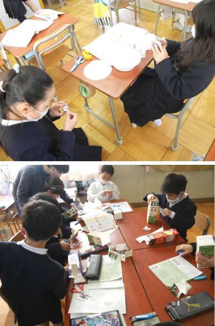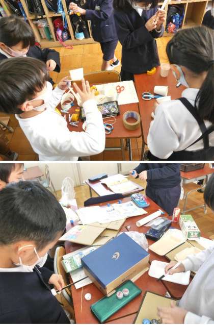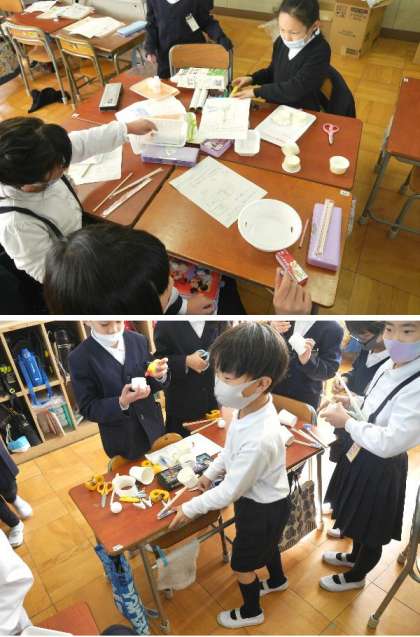 2年生では、身の回りのもので楽しく遊ぶために、くふうくながらおもちゃを作っています。空き箱や、輪ゴム、洗濯ばさみ、ストロー、ペットボトルキャップなどいろいろと使って楽しみます。