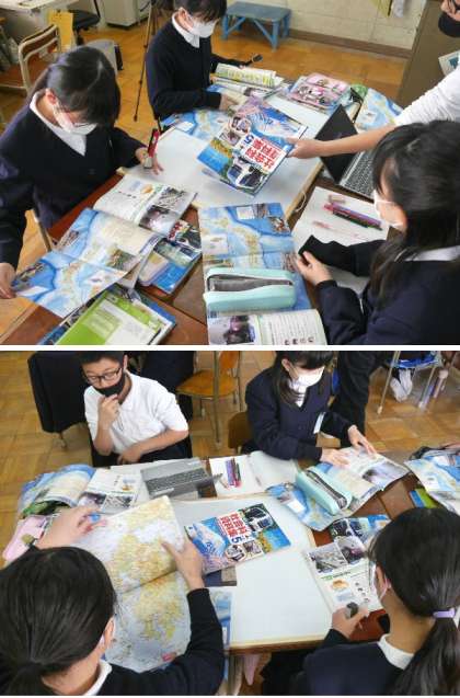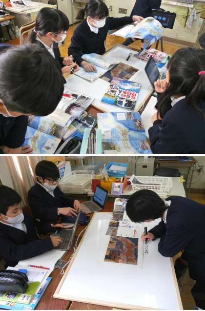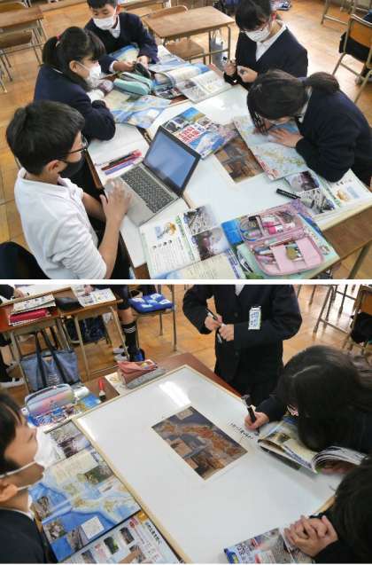 5年生が、大きなホワイトボードに、日本地図がはられています。地震や台風など日本で起こった自然災害についてマップを作ってまとめています。