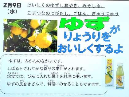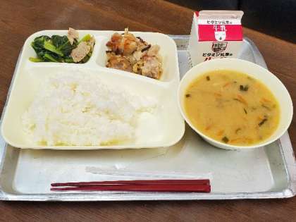 今日の献立は、鶏肉のゆず塩焼き、みそ汁、小松菜のにびだし、ごはん、牛乳でした。