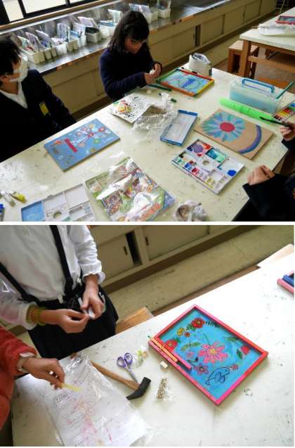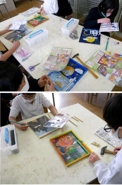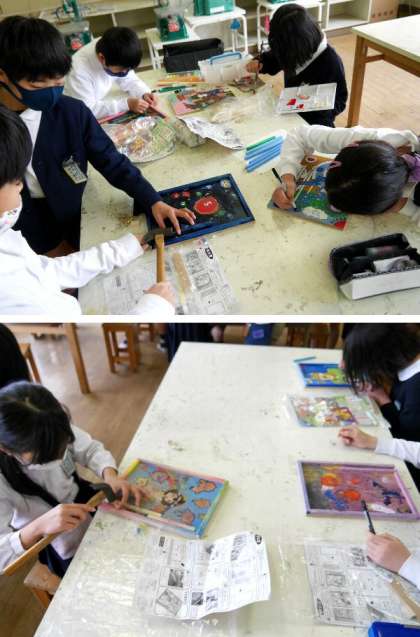 4年生が図工室で、ボールころがしゲームの最後のくぎ打ちをしています。このくぎうちで、どうボールが動くか決まるので慎重にがんばりましょう。