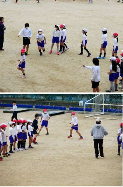業間おおなわとび、今日は3年生です。運動委員の児童が回してくれるロープを一人ひとり跳びます。