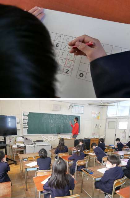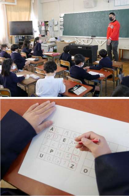 2年生の英語にクリス先生が来てくれました。マス目にアルファベットを書いて、ビンゴゲームです。縦横ななめとそろってくると、どんどん盛り上がっていました。