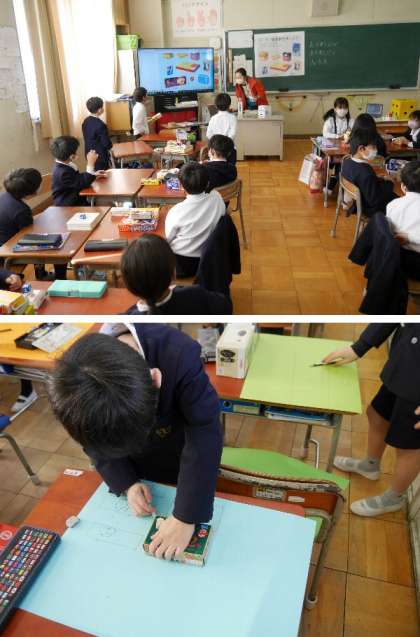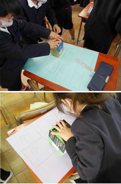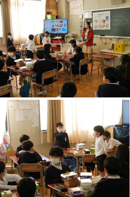 2年生の算数では、持ってきたいろいろな大きさや形の空き箱を使って学習しています。