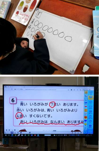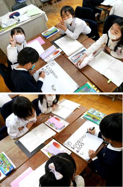 1年生では、文章問題から式をつくって問題を解く学習をしています。ホワイトボードに図を書いて考えてから式を作ります。各班ごとに考えて、みんなの前で発表します。だんだん算数の計算もできるようになってきましたね。