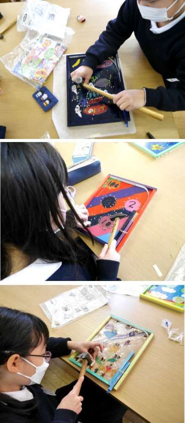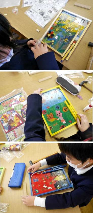 4年生がていねいに作ってきた玉ころがしゲームが完成しました。最後に玉のころがるところに釘を打って完成です。釘の並び方でゲームのむずかしさが変わりますね。