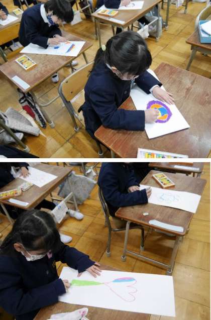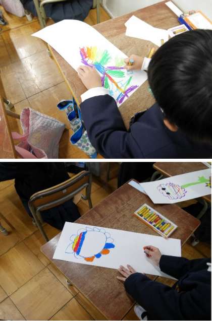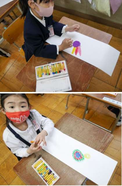 1年生が画用紙に、卒業する6年生のための掲示を作っています。想像であったらきれいだろうなという花を描いていました。