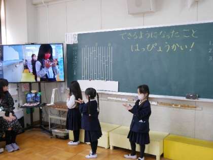 1年生が、できるようになったこととして、あやとりを皆の前で発表していました。あやとり以外にも、お手玉や、竹とんぼなどを発表しました。