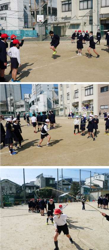 4年生は、6年生と大縄跳びを一緒に楽しんで、卒業前の思い出づくりをしました。最後に、6年生から学級で使う手作り雑巾をもらいました。