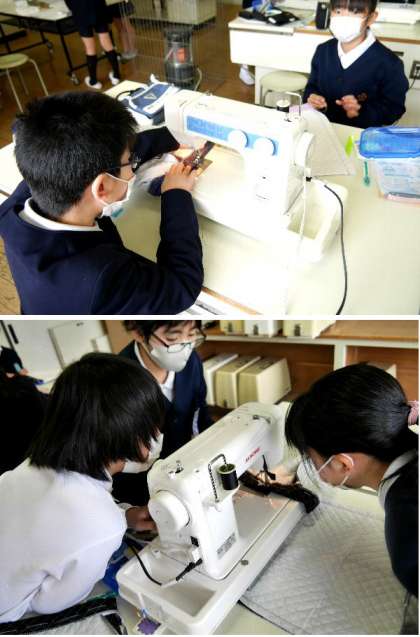 5年生が家庭科室でミシンをかけています。トートバッグを作っていました。ていねいに作業をしています。いいものができそうですね。