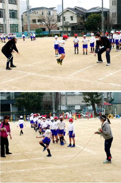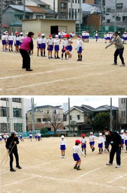 1年生の体育では、大縄跳びの練習です。タイミングをあわせたり、よく見ながら跳ぶことにも、少しずつできるようになってきましたね。