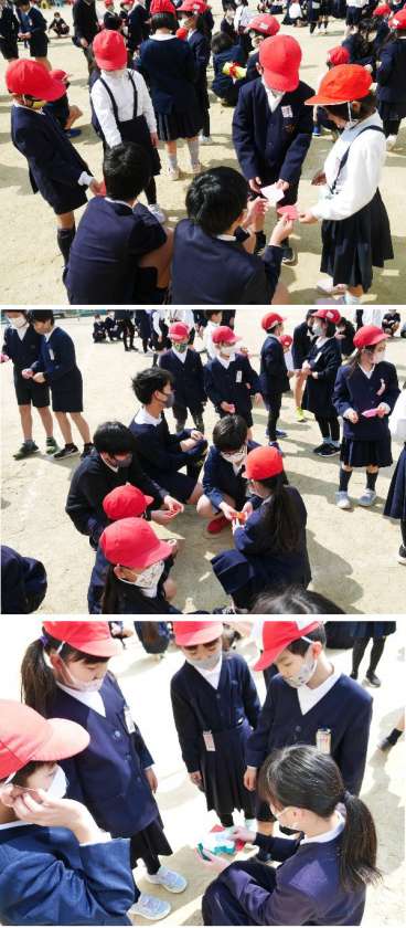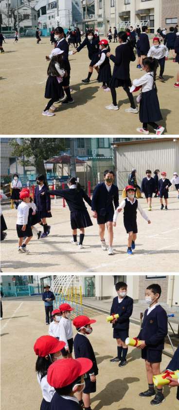 1年生が、6年生との思いでづくりとして、運動場でおにごっこをしました。6年生と1年生がセットになってのおにごっこです。ほほえましいですね。手をつないで逃げている子もいます。最後に、6年生から自作の雑巾が手渡されました。