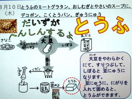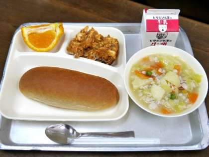 今日の献立は、豆腐のミートグラタン、おし麦と野菜のスープ煮、デコポン、黒糖パン、牛乳でした。