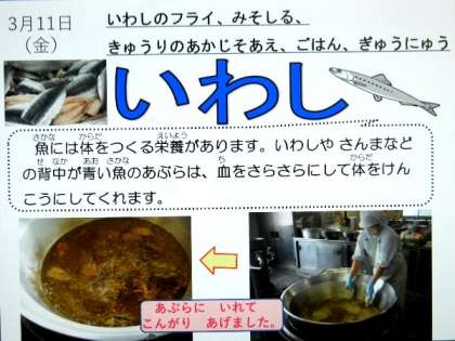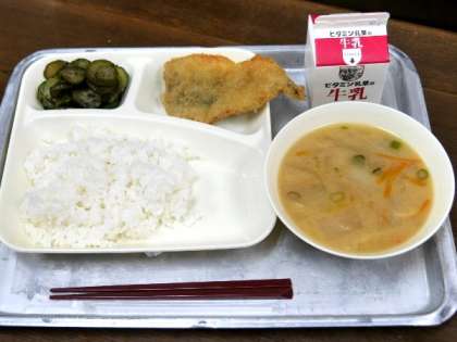 今日の献立は、いわしのフライ、みそ汁、きゅうりのあかじそあえ、ごはん、牛乳でした。